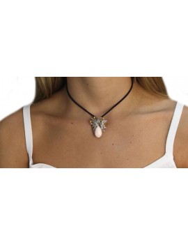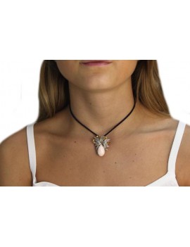Pendant in white gold, pink coral, diamonds and topazes.