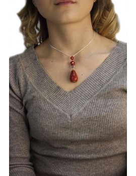 Imponente e particolare pendente in corallo, con particolari in oro giallo e argento 9 kt, composto da due fiori in corallo intagliato, impreziositi da una perla centrale, che sorreggono una goccia di corallo, collegata da piccole foglioline impreziosite da rubini e diamanti.