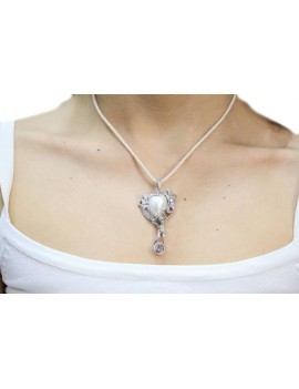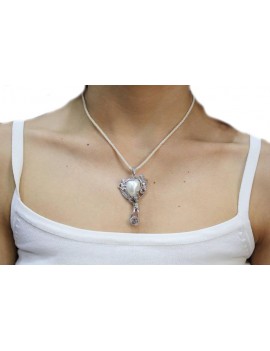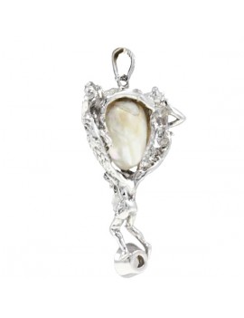 Particolare ed imponente pendente raffigurante un custode dell'amore che sorregge un cuore di perla. Tutto è impreziosito da diamanti.