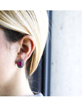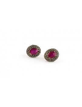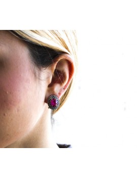 Deliziosi orecchini montati in oro rosa e argento 9 kt, composti da un unico rubino centrale e, circondati da vecchi diamanti, che rendono questo gioiello molto affascinante, grazie alla loro lucentezza.