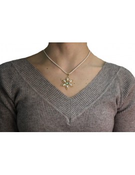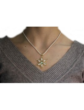 Delizioso pendente che ci ricorda il fiore a sei petali della Stella di Betlemme, montato in oro giallo 18 kt, con delicate perle al centro dei petali.